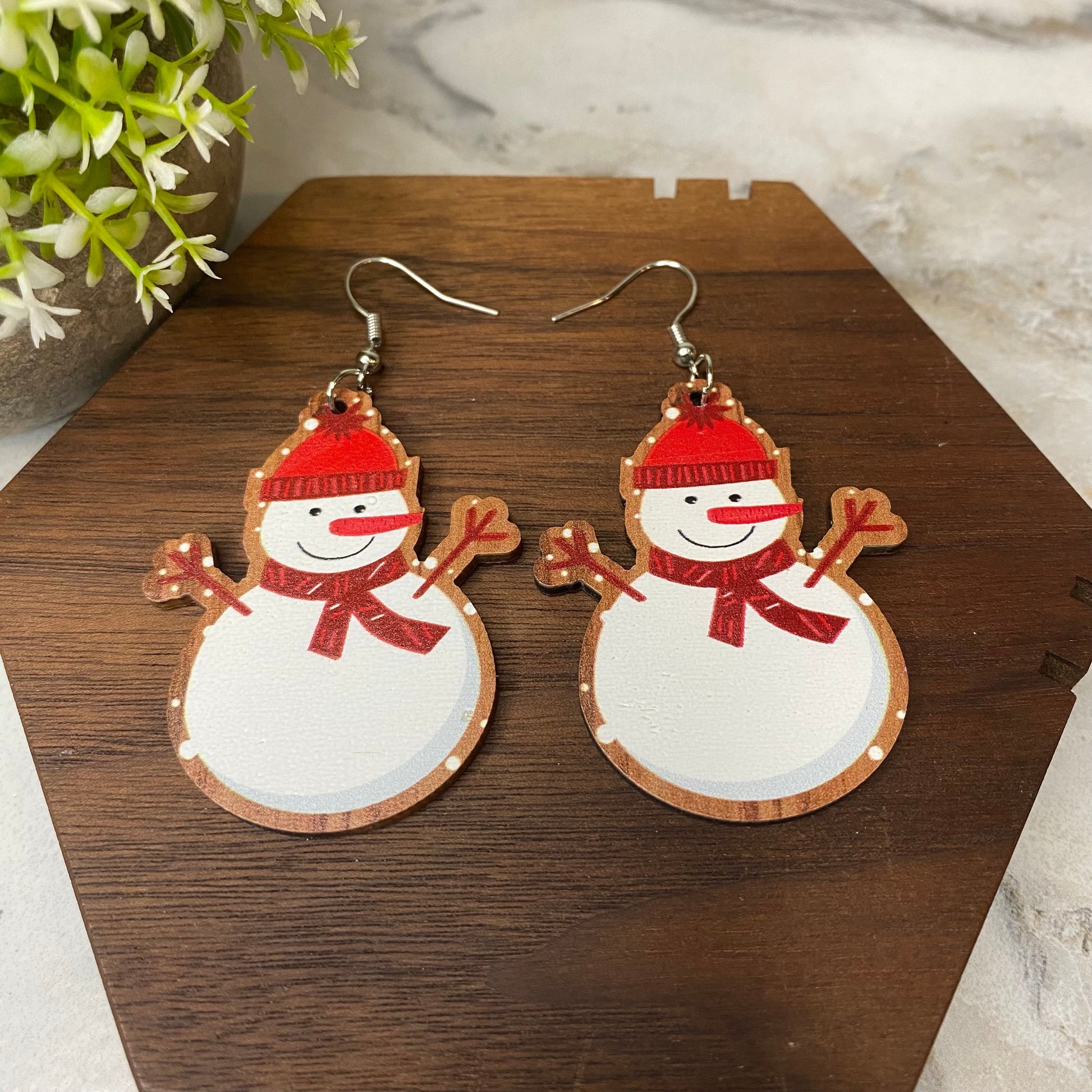 Wooden Dangle Earrings - Christmas - Snowman Hat Scarf